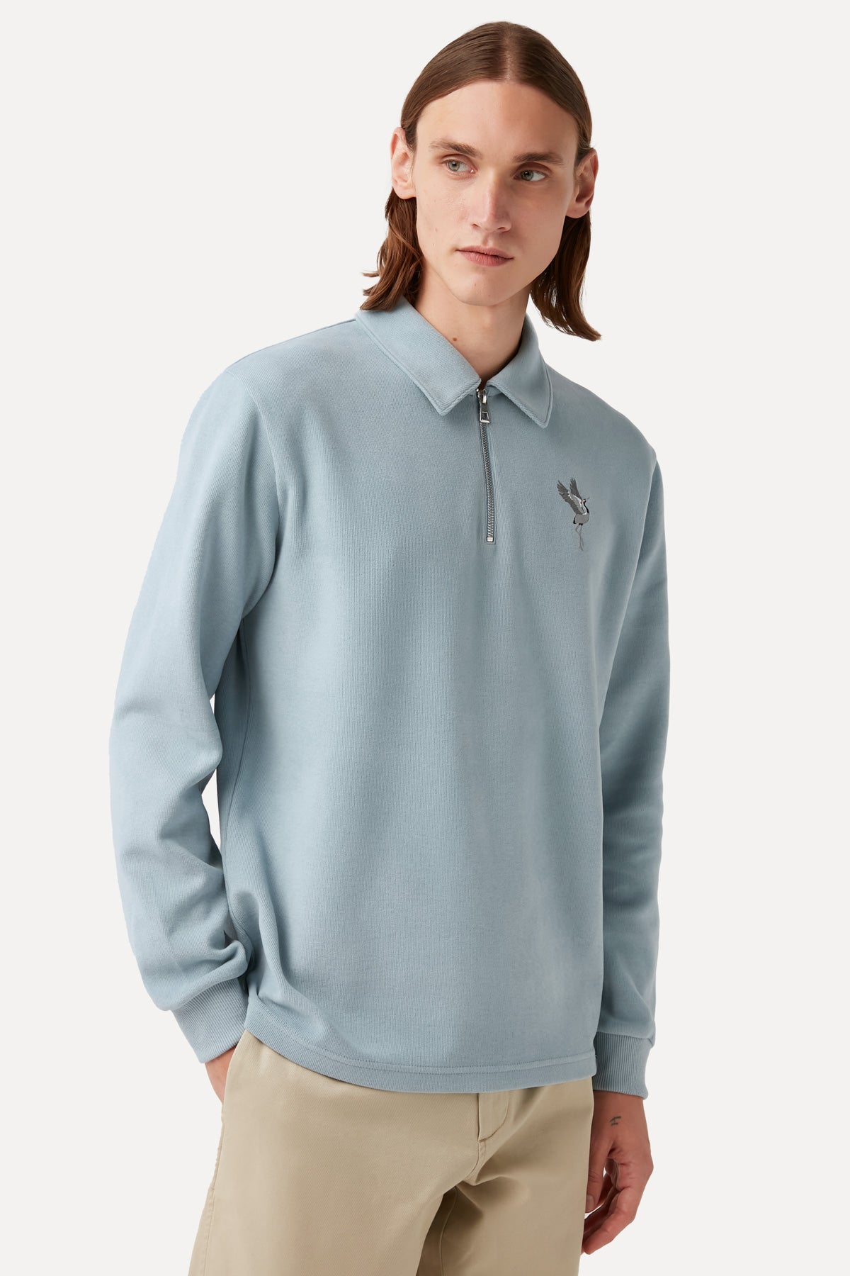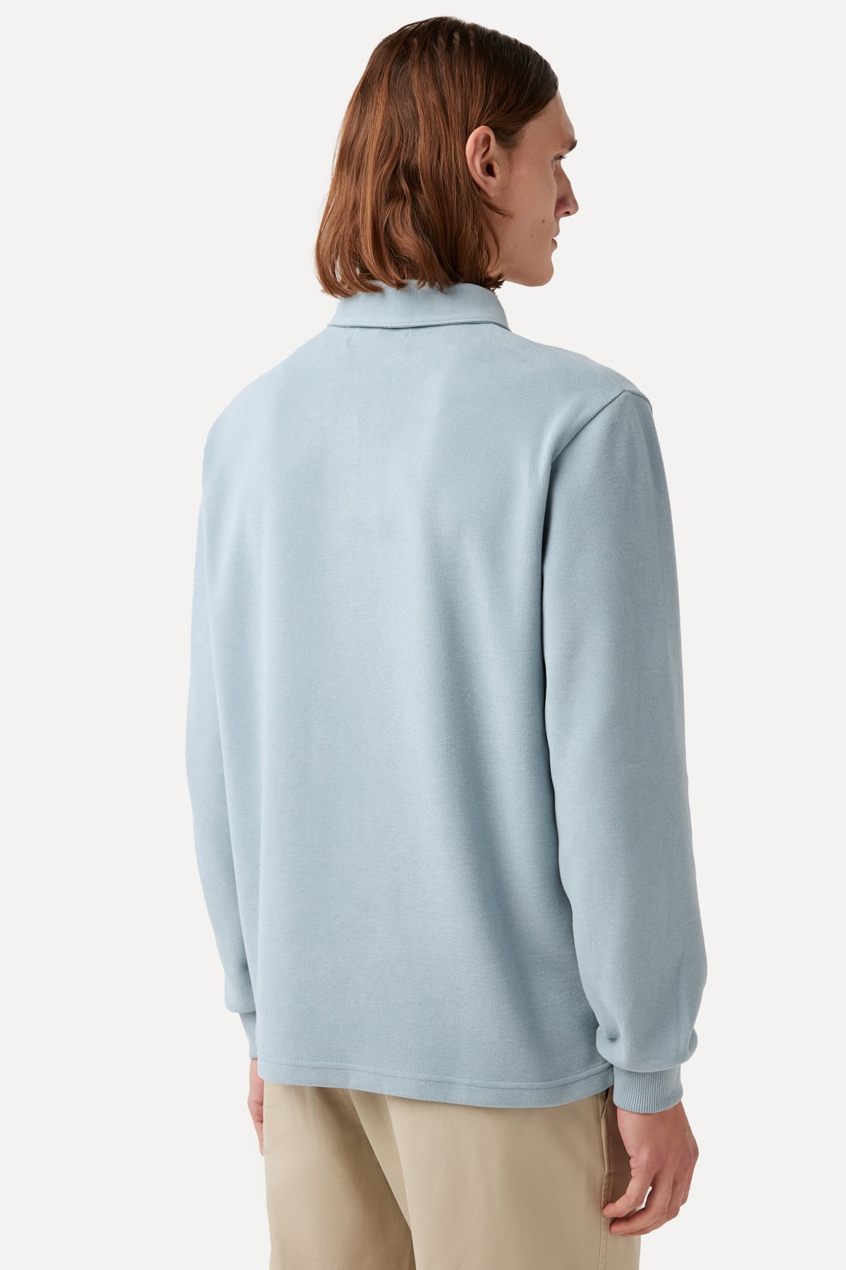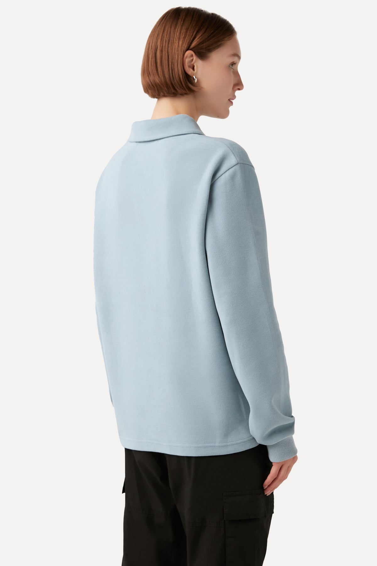 GOTS sertifikalı pamuktan ve geri dönüştürülmüş polyesterden üretilen bu gömlek yaka sweatshirt, mevsim geçişlerine uygundur, yumuşaklığıyla ön plana çıkar ve bedene tam oturur.