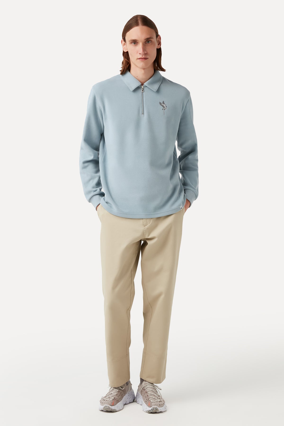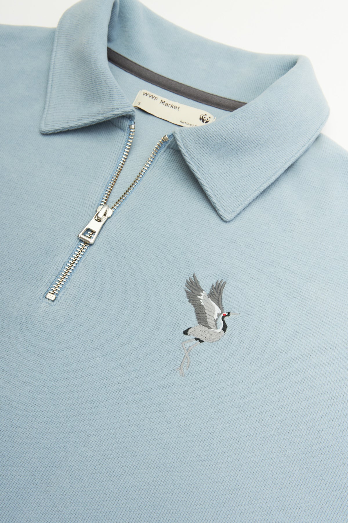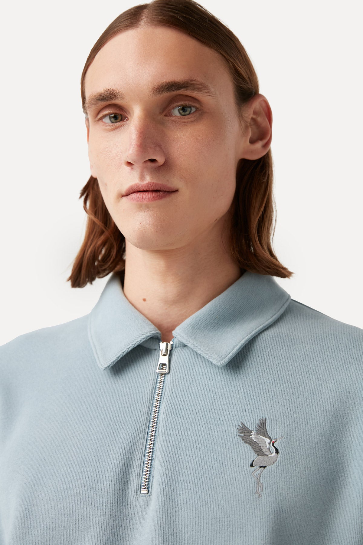 GOTS sertifikalı pamuktan ve geri dönüştürülmüş polyesterden üretilen bu gömlek yaka sweatshirt, mevsim geçişlerine uygundur, yumuşaklığıyla ön plana çıkar ve bedene tam oturur.